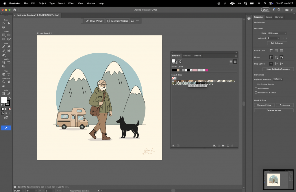 We also explored secondary elements separately: the dog’s silhouette, the camper van, and the mountain shapes. These were intentionally kept simple, almost symbolic, to avoid visual noise.