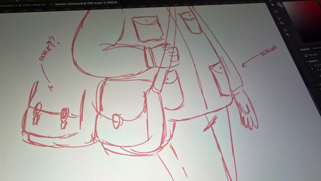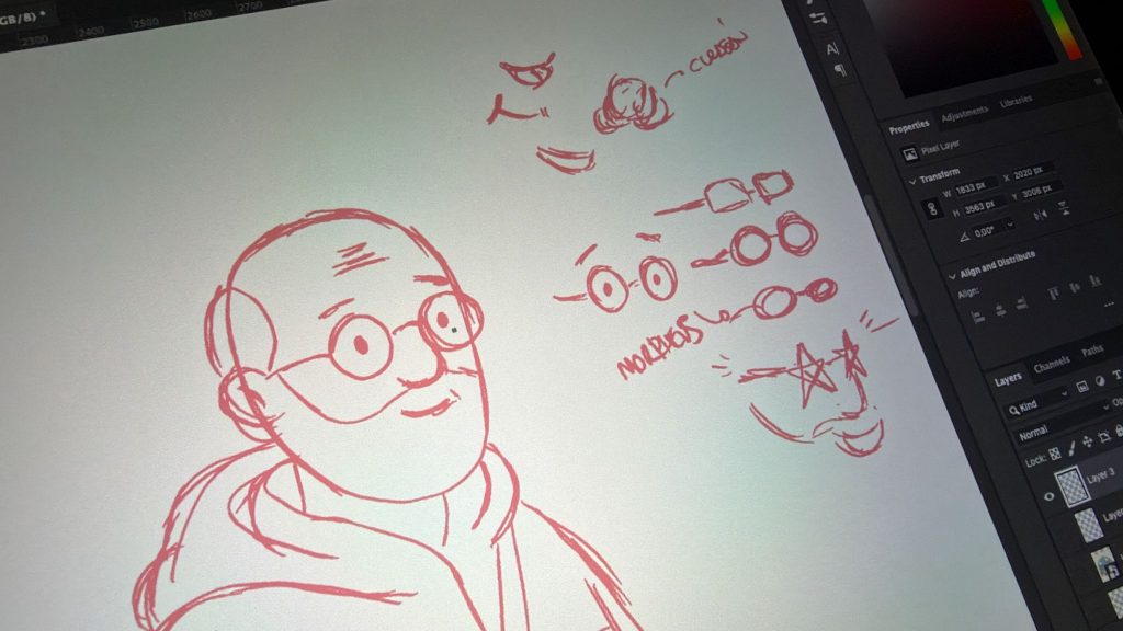 We began with rough pencil sketches, focusing on posture, proportions, and expression. At this stage, nothing is precious — faces change, glasses move, jackets grow pockets, and accessories appear and disappear.